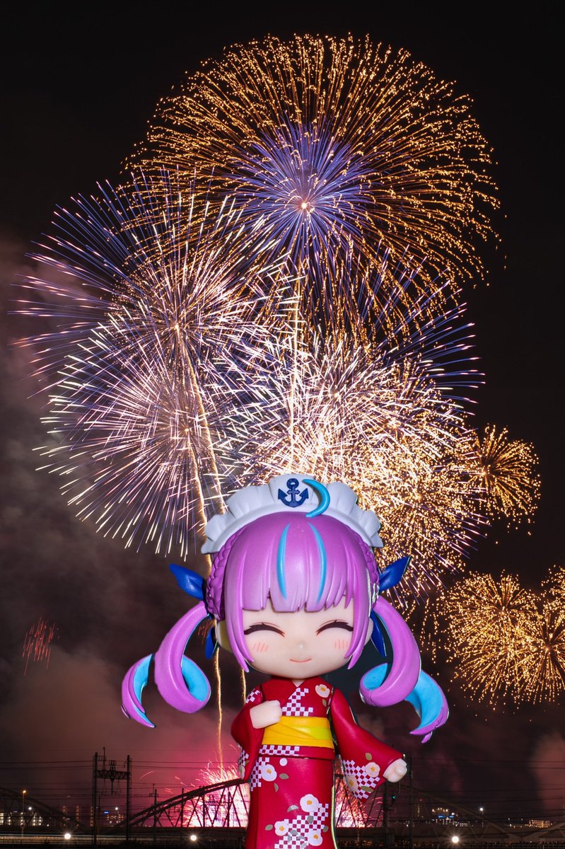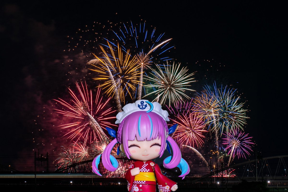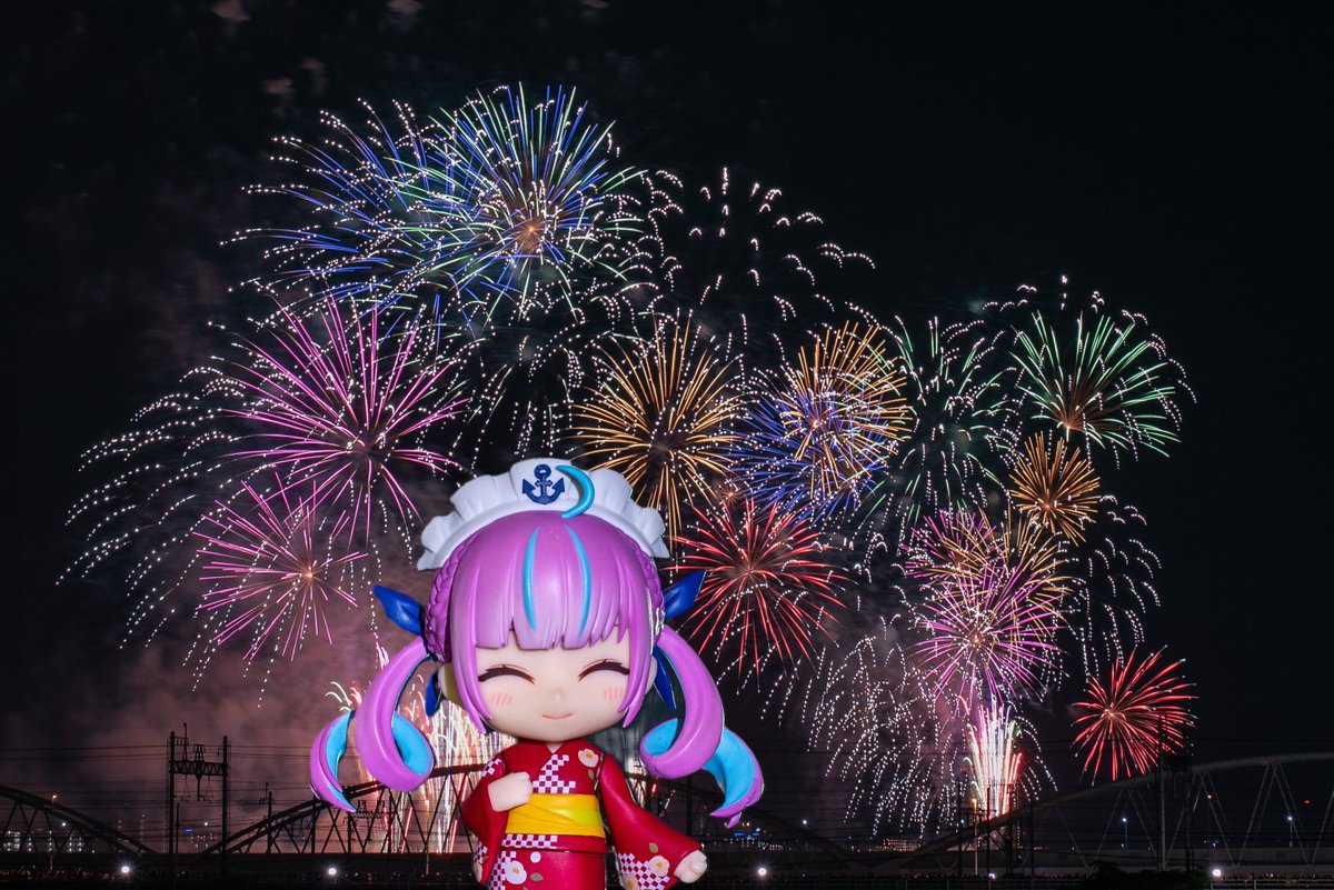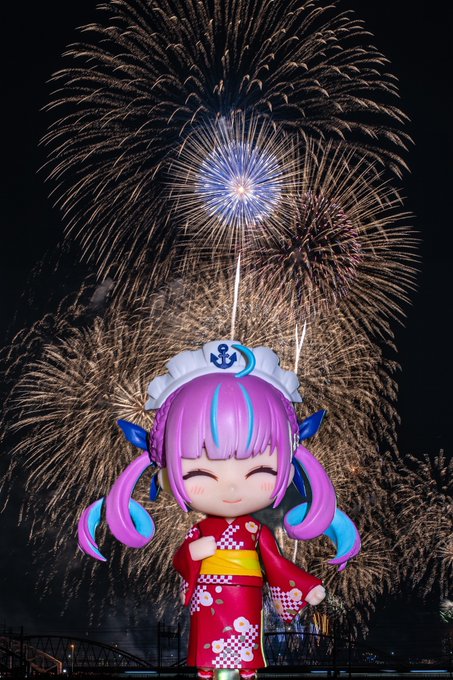 夏の風物詩 夜空に打ち上がる綺麗な花火と共に 浴衣のあくたんのねんどろいど⚓️ #湊あくあ #あくあーと #ねんどろいど