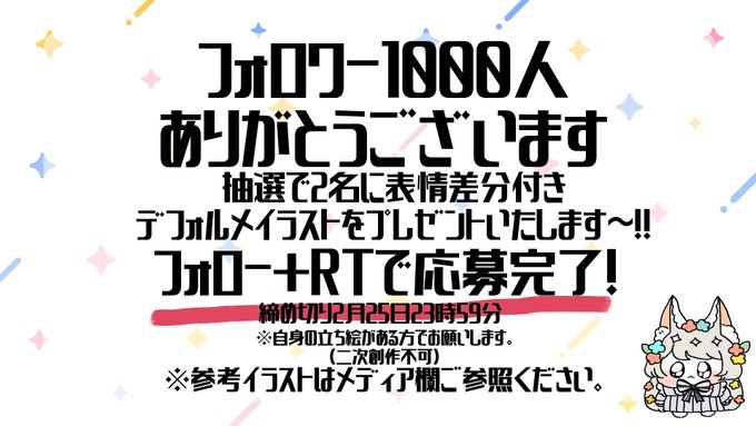 フォロワーさん1000人ありがとうございます! 感謝・感激・デフォルメ描きます~~!! ✨フォロー+RTで応募完了✨ 抽選で2名様に表情差分付き・お好きなポーズでお描きします! 締め切り:2月25日23時59分まで ※参考イラストはメディア欄ご参照ください