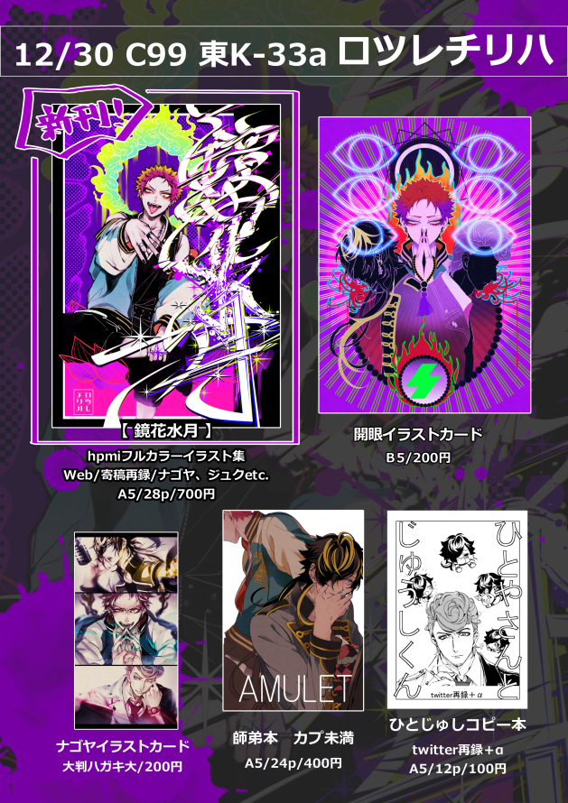 冬コミのお品がきアップしました! 新刊はフルカラーイラスト集です(ナゴヤ多めその他ジュクなど)ウェブに載せたものや寄稿の再録ですがビビットカラーで出してもらったので現物是非見てやって下さい☆ twst本も持っていきます! 久しぶりのコミケ楽しみです! 【12/30 C99 東K-33a ロツレチリハ】
