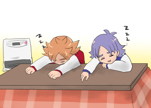 #イナイレいつでも真剣お絵描き60分一本勝負 北海道はコタツの使用率が低いらしいけど遠征先の旅館のコタツが想像以上に気持ち良くてダメになる吹雪兄弟が見てみたい…