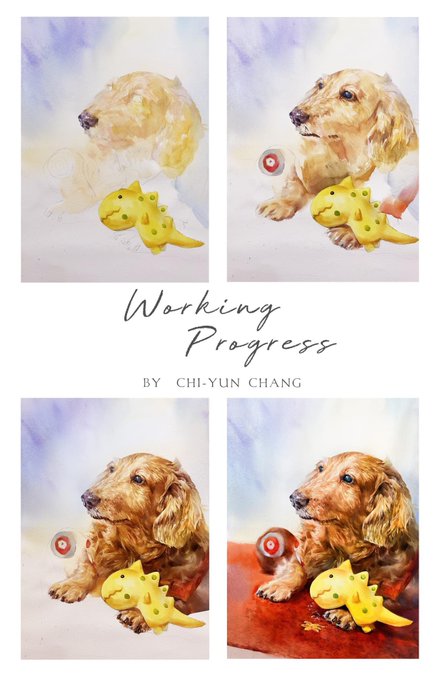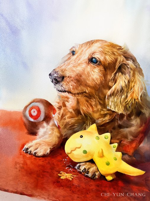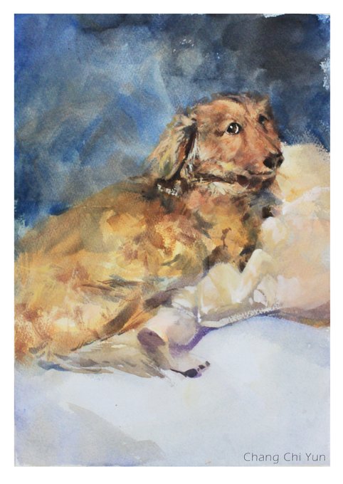 My work. 2021 watercolor,8k 原本是想用透明水彩, 殊不知撇下去發現紙張受潮...心一橫用不透明技法給他加下去...至少狗臉救得回來啦😂! #水彩画 #watercolor #taiwan #painting #artwork #illustration #水彩 #art #artwork #drawing #watercolorpainting #watercolorart #dog #daschund #臘腸狗