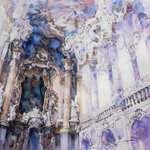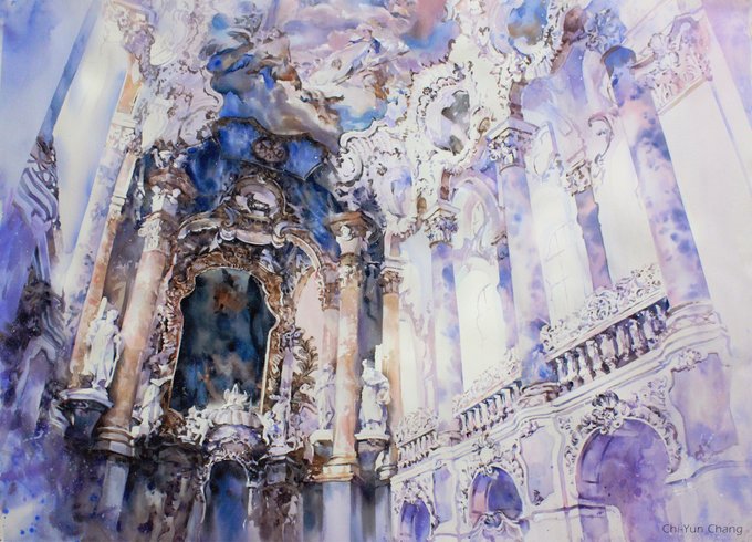 My work. 《The sanctuary of Wies》 2021 watercolor,104 x 75 cm 外表不起眼,但一踏入就被內部極盡華麗精緻的洛可可風格震懾,至今無法忘懷。 #水彩画 #水彩 #watercolor #taiwan #artist #sketch #painting #artwork #illustration #art #artwork #藝術 #watercolorpainting #wieskirche #church