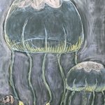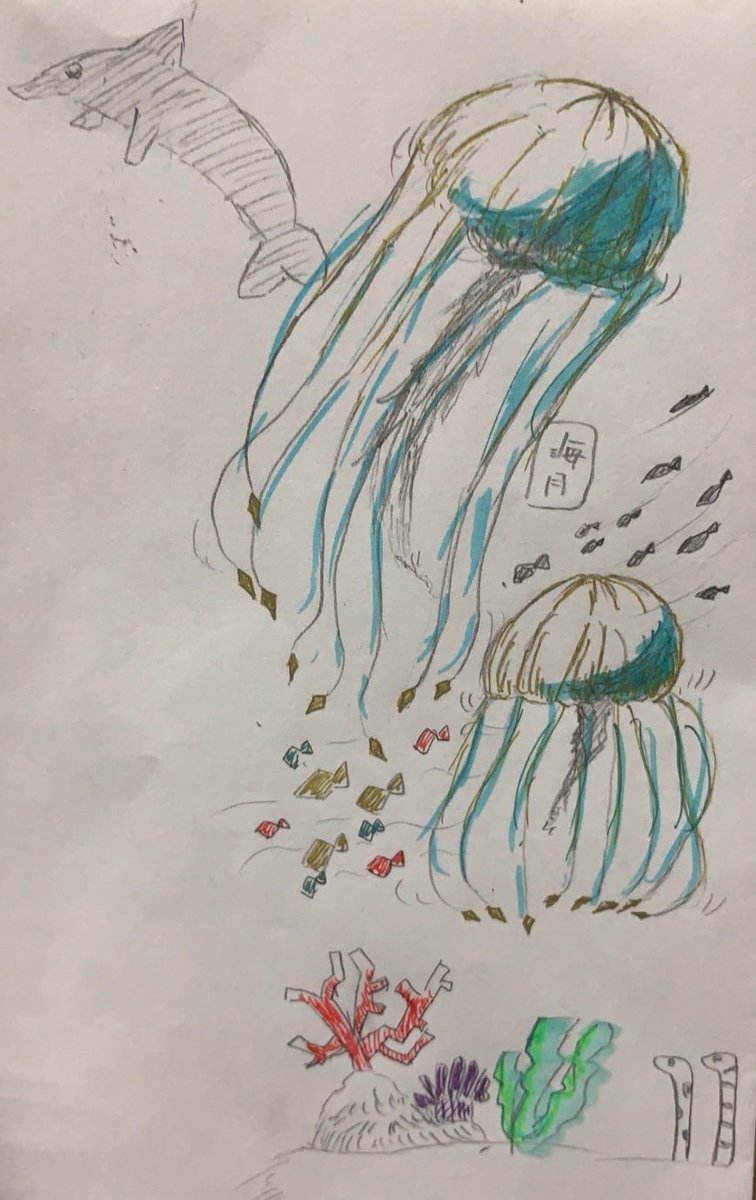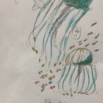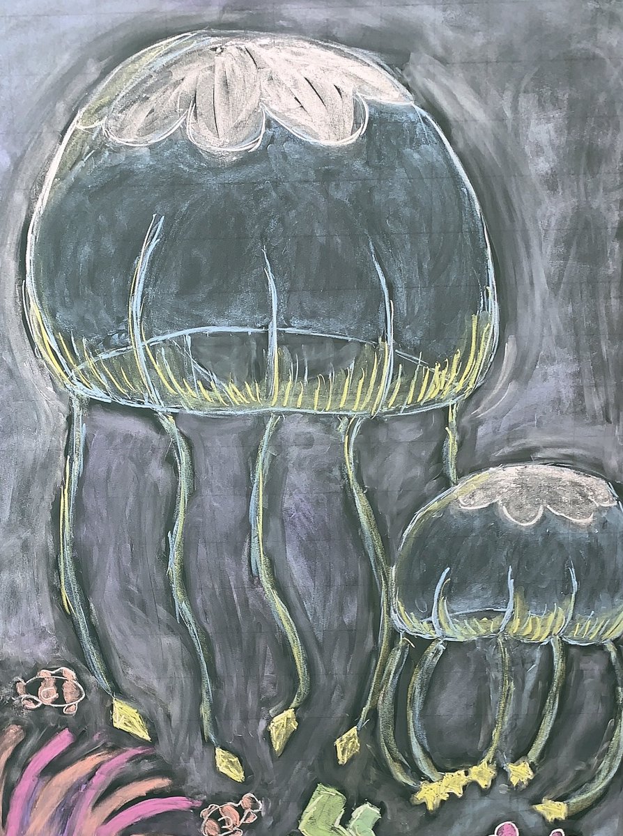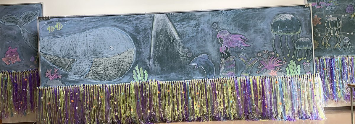 <再投稿> ここ数日の海月の成長録。 そして本番の黒板アート。 (3枚目は国語の授業用の手が汚れない様にするやつだから、左側空き気味で描いてた。) #イラスト #水中 #落書き #イラスト好きな人と繋がりたい #絵師さんと繋がりたい