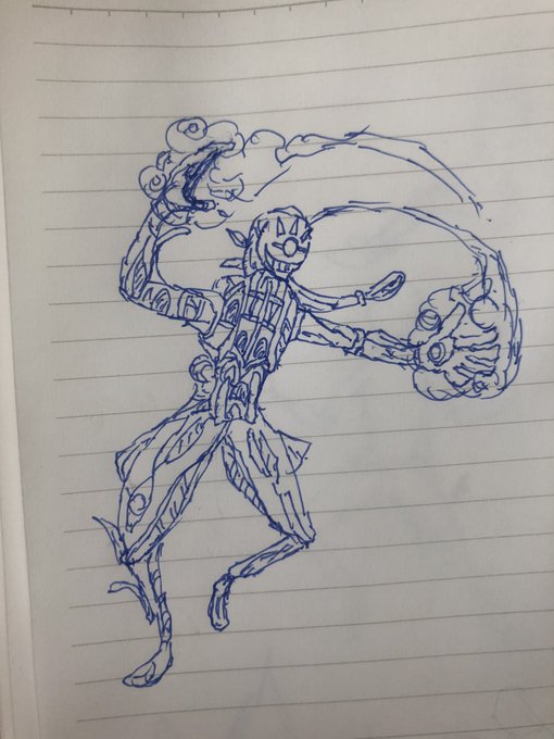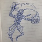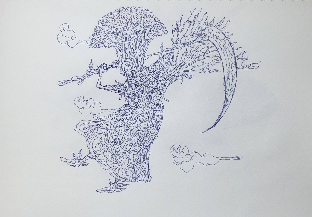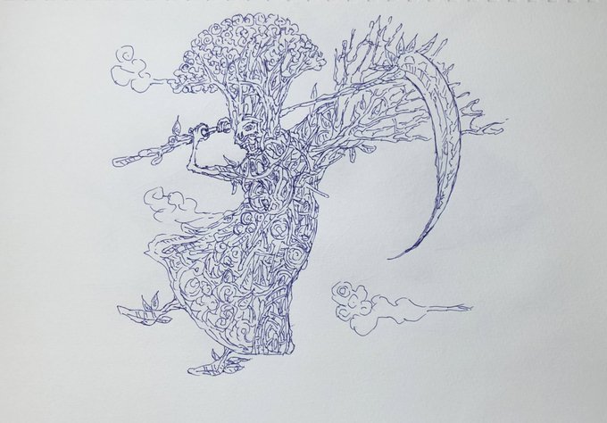 忙しさにかまけてきちんとした食事を摂らないサラリーマンを中心に、体調の管理を警告する死神。 #頭がブロッコリー #絵かきさんと繋がりたい #ペン画 #青ペン #絵柄が好きっていう人にフォローされたい