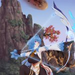 アンバーちゃんの完成度あげつつ、真ん中の雲の情報量落として距離感と統一感を出してる最中 #wip #genshinimpactfanart