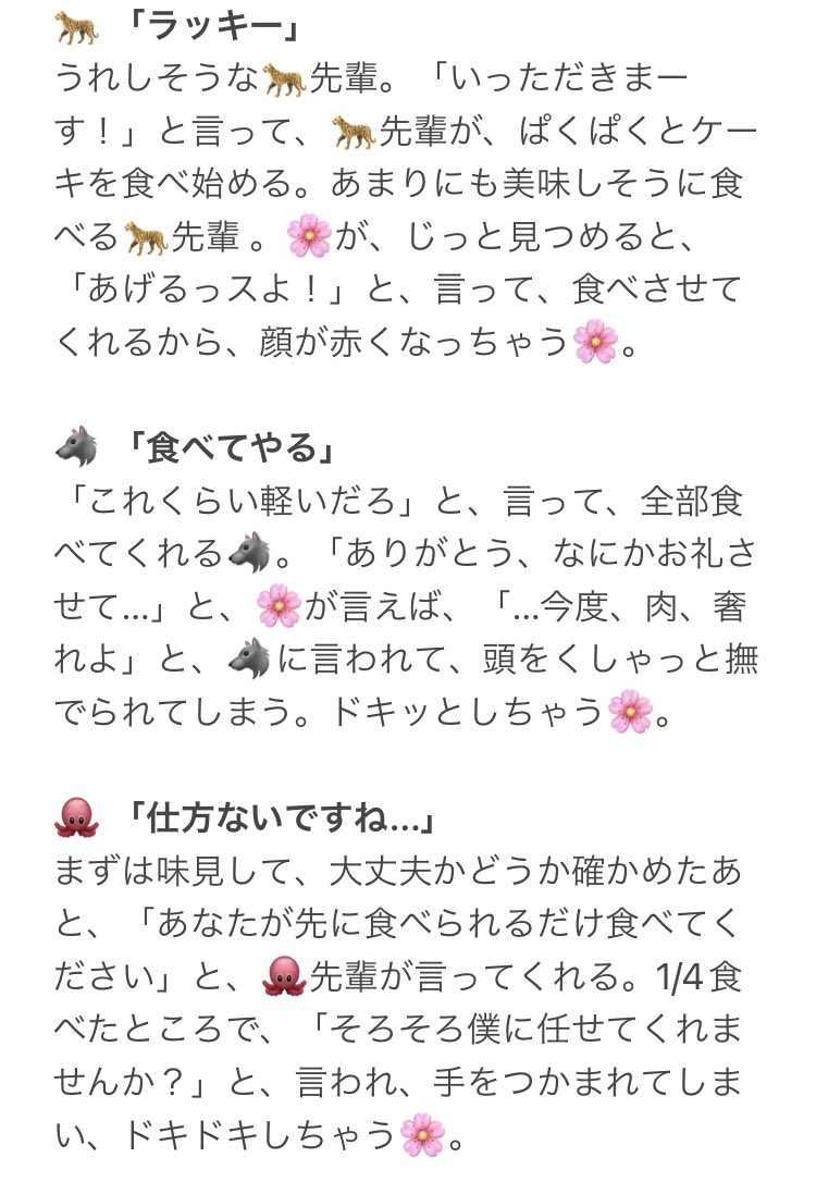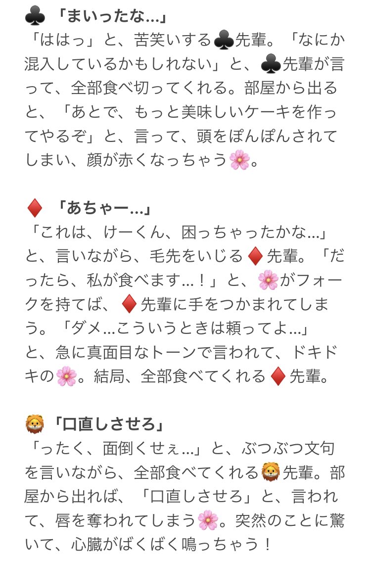 6 88 ホールケーキを食べないと出られない部屋。(ただしフォークは1本) 🌹❤♠️♣️♦️🦁🐆🐺🐙🐬🦈🦦🐍👑🏹🍎💀🤖🐉🦇⚔️⚡️ テンプレ自作です。 (配布します) ツリーに続きがあります。 (1/3) #twstプラス #twst夢 23/06/05 20:38
