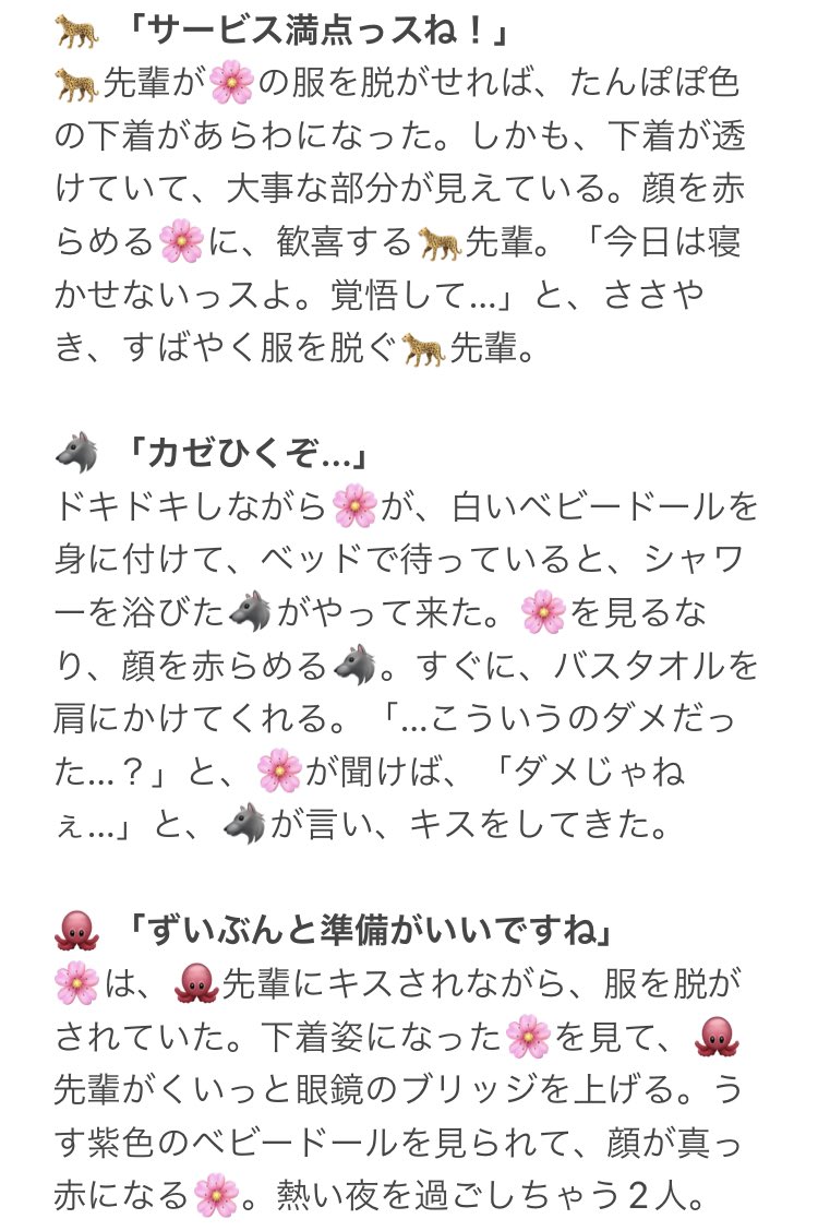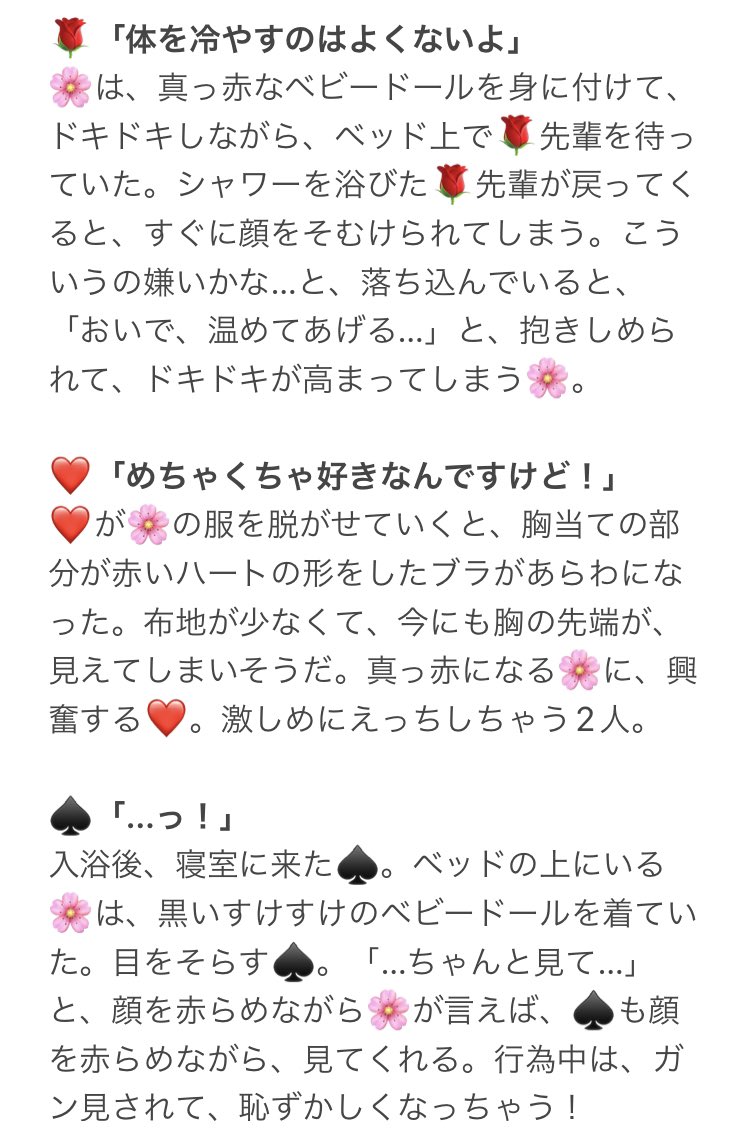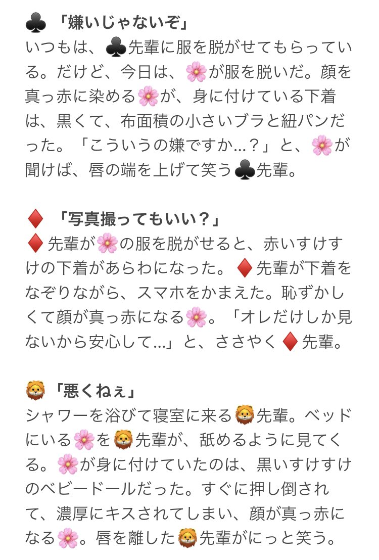 もし🌸がえっちな格好してたら…。 内容ちょっとえちえちです。 🌹❤♠️♣️♦️🦁🐆🐺🐙🐬🦈🦦🐍👑🏹🍎💀🤖🐉🦇⚔️⚡️ テンプレお借りしました! ツリーに続きがあります。 (1/3) #twstプラス #twst夢