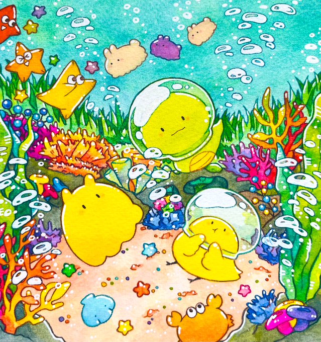 🐍🐥ちゃんの水中探索〜🐙🫧 #ゆるいイラスト #メンダコ #へび