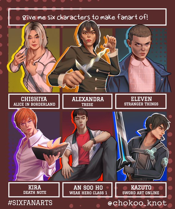WIP WIP WIP WIP WIP WIP #sixfanarts #sixfanartschallenge #AliceInBorderland2 #Chishiya #alexandraTrese #Trese #StrangerThings #MillieBobbyBrown #deathnote #WeakHeroClass1 #choihyunwook #ansooho #SwordArtOnline #kazuto