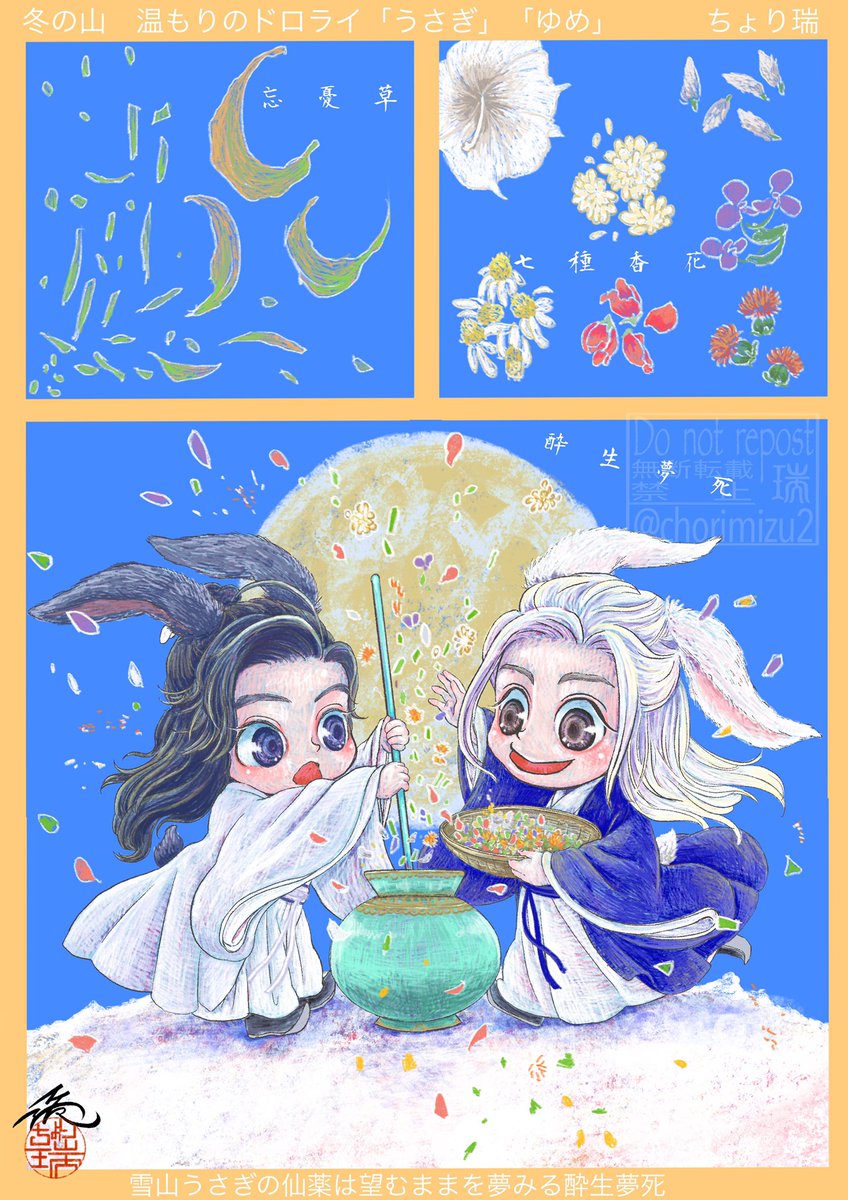 5 17 冬の山 温もりのドロライ 「うさぎ」「ゆめ」 今年もよろしくお願いします! 雪山うさぎの仙薬は望むままを夢みる酔生夢死。 (忘憂草、七種の花はイメージです) #冬の山ドロライ 23/01/04 00:05