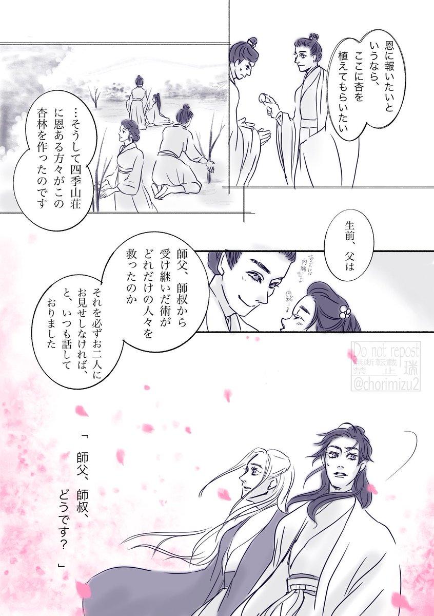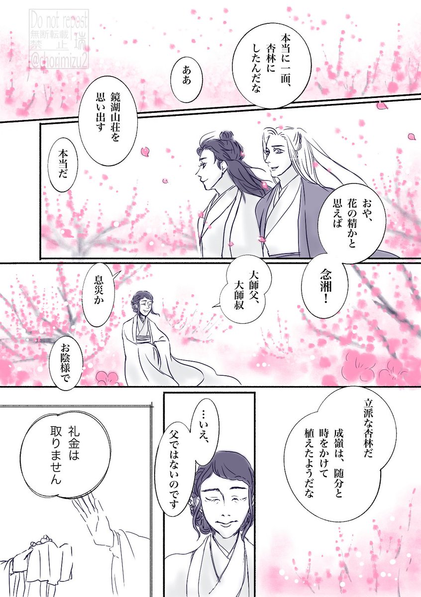 7 41 衍と⼦舒。現代AU?? 古武術道場四季山荘。春の特別古装稽古です。 「花は常にあり、天下の事情を知り尽くす」と謳われたこの山荘では、多様な世界の文化を体験しかつ仲間との円滑な意思疏通をはかるため、特別古装稽古の後、門弟たちによるフォークダンスが行われます🌸 #四季の山ドロライ 23/03/07 09:37