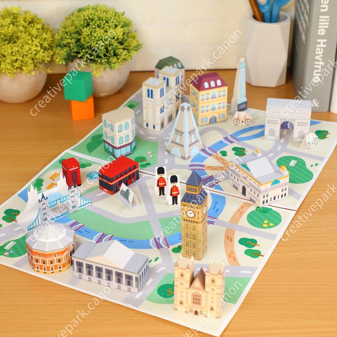 キヤノンクリエイティブパーク✂️『かんたんジオラマ :世界の街並み(ロンドン風)と(パリ風)は道が繋がるんです😊 ▼Paris 風 onl.tw/6a7XTmW ▼London 風 onl.tw/taMR915 CL:Canon AD:@uplift_official #CreativePark #ペーパークラフト #簡単にできる #工作