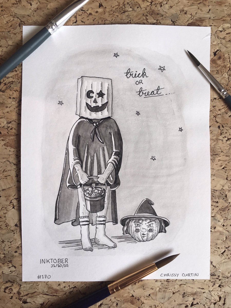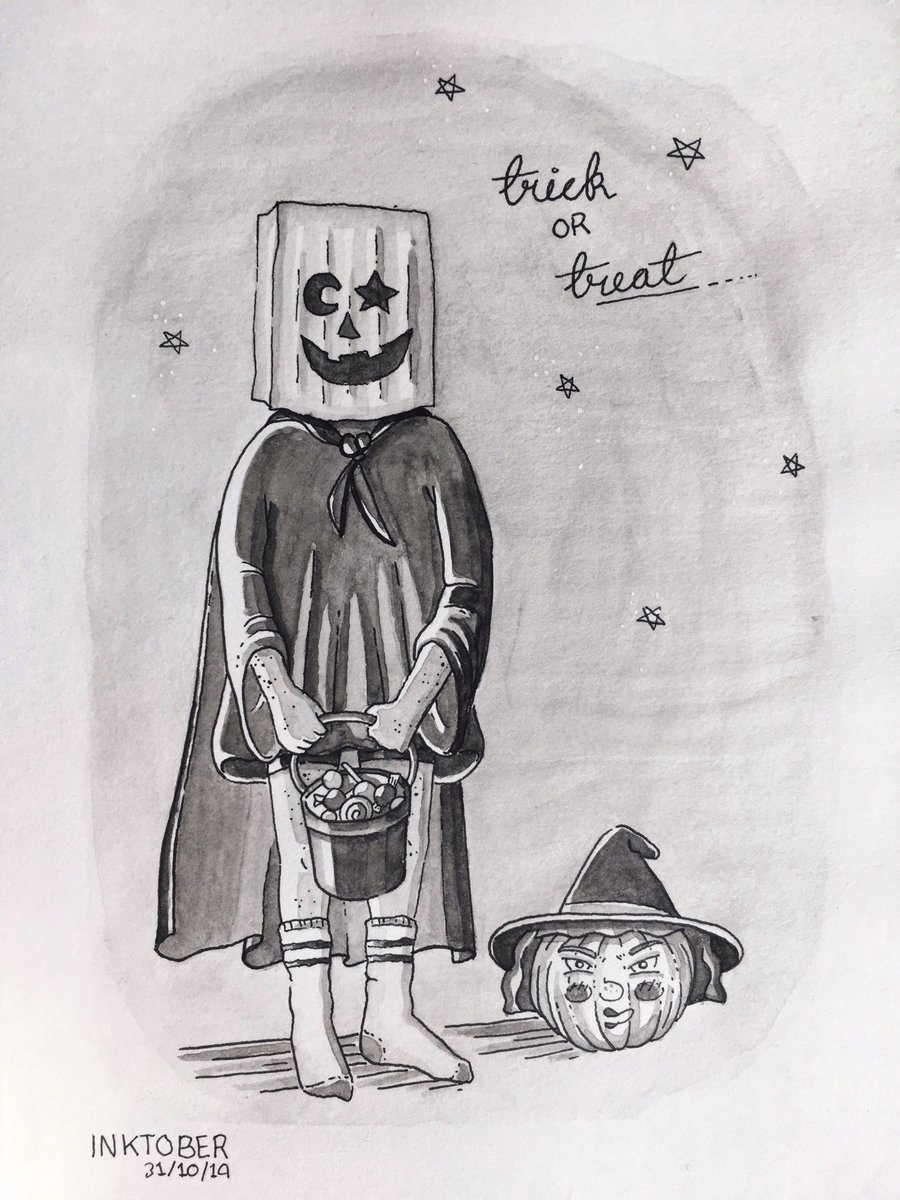 HAPPY HALLOWEEN! Oh wait that was 5 months ago...when I originally sketched this drawing 170/365 😂. And I’ve finally painted it today 🥳! I forgot I wanted to paint my mushroom prompt too 😭...so I have to wait 1 more day to finish #inktober2019 (so late 😂). #365drawingscc
