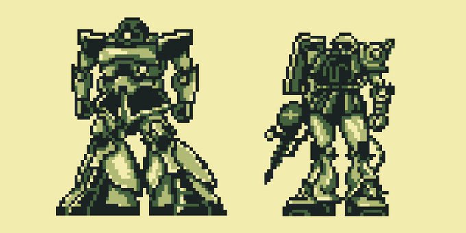 唐突にザクが描きたくなったのでザクを描きました。久々のドット絵です。 それぞれ64×64の範囲で作りました。 #PixelArt #ドット絵 #ザク #ガンダム
