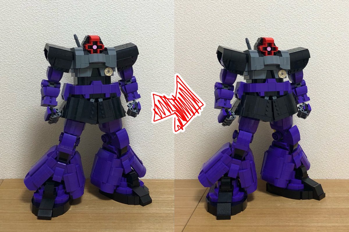 ここ最近はドムの大改修をしていました。2枚目の左側が以前、右側が改修後です。 腹部を1ポッチ短くし、その分足に厚みを持たせ、より大きくしました。 胴体の間延び感が無くなり、全体のバランスが良くなったと思います。 #LEGO #MOC #レゴ #レゴロボ #ガンダム #ドム