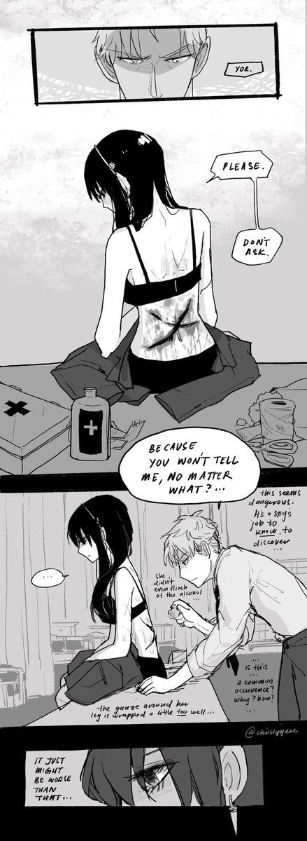 Here’s some light angst to balance out the fluff. She’d said nothing since, wordlessly bandaging all his cuts—her cuts. It stings. He didn’t fight her. #SPY_FAMILY #SPYxFamily #loidyor #loidxyor #twiyor #loidforger #yorforger #sxf #spyxfamilyfanart #fanart