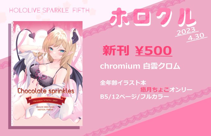 4/30(日)ホロクル5thのお品書きです~! 新刊ちょこ先生オンリーフルカラーイラスト本 (※1ページだけメルキスイラストあります!) 【J-12】 chromium でお待ちしております~!☁ twitter.com/i/web/status/1…