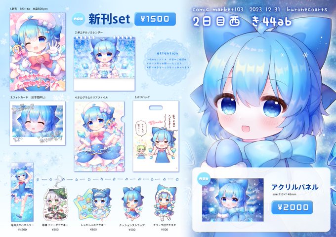 145 521 ◎あなたのサークル「kuronecoarts」は 日曜日 東地区 “コ” ブロック 28b に配置されています。 スペースいただきました! チルノちゃんと妖精たちの本とグッズ作ります🐳 23/06/09 17:45