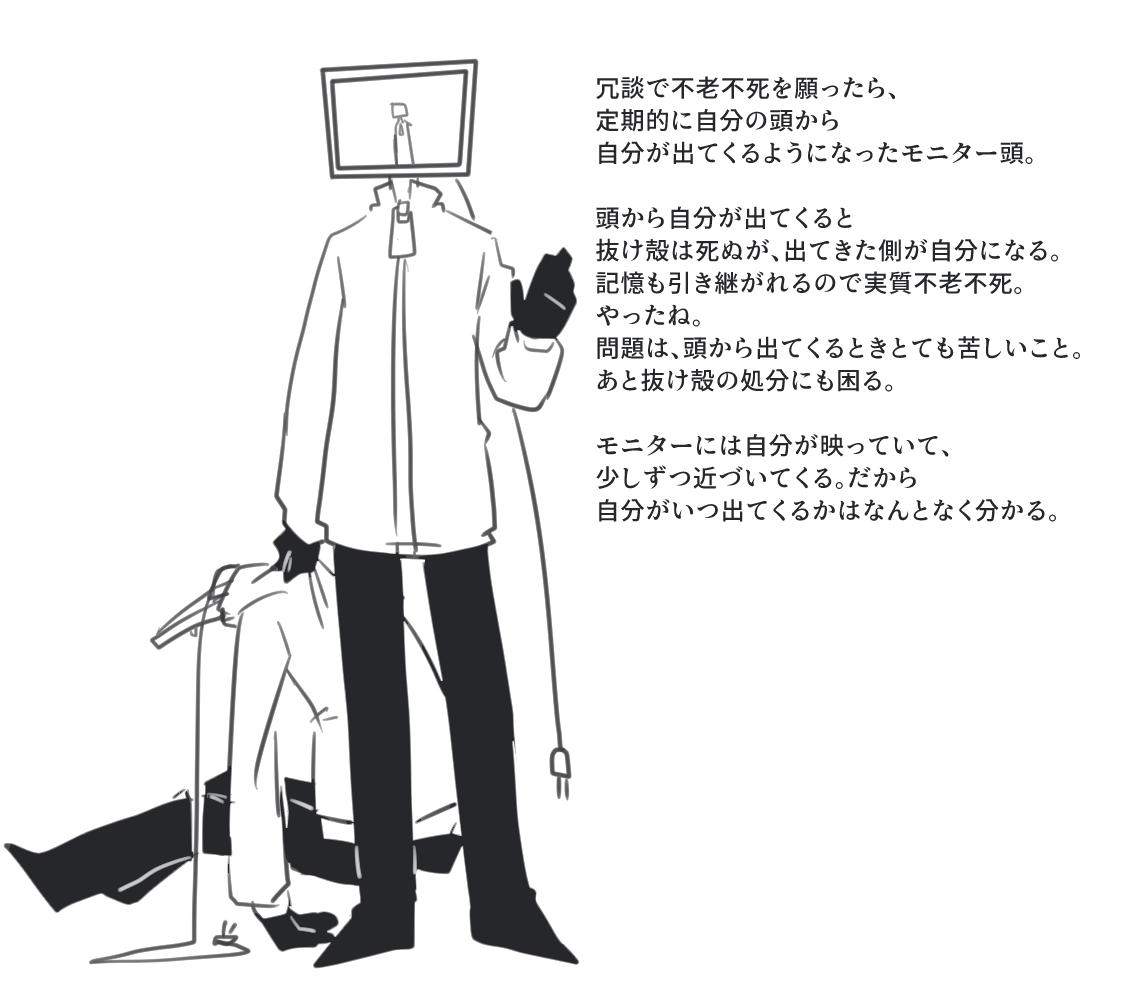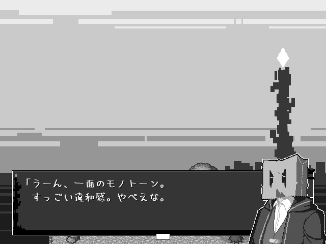 freem.ne.jp/win/game/22991 というわけで、わりとゆるいゲームができました。 紙袋ボーイが灰色の世界に飛ばされたので帰るために原住民と塔を上るゲームです。異形頭要素は(前作よりは)ありません。 #色のない塔より