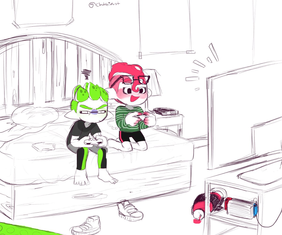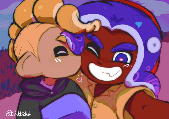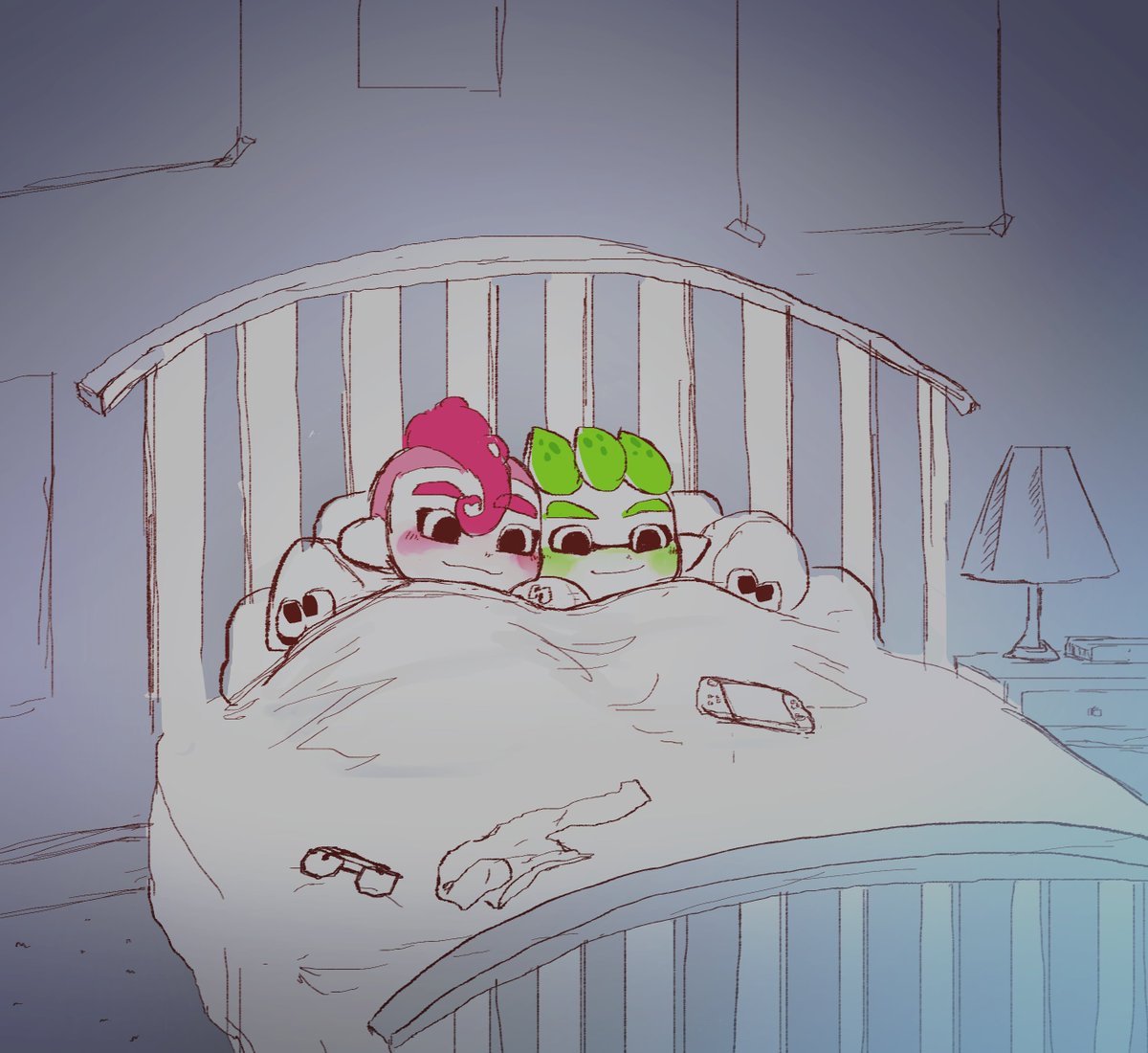 octoling and inkling scooting closer together in bed happy splatoon