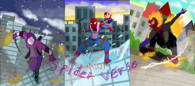 『繫がるバース』 を描きましたー! 三つの絵をつなげるようにしました。 スパイダーバースのポスターすげぇ! #illustrationart #イラスト #絵描きさんと繋がりたい #SpiderVerse