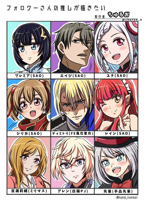 #フォロワーさんの推しが描きたい 9人描けましたー!エイユナレインちゃん以外は初描きかな…。プレミアちゃんとシリカちゃん描くの楽しかったお☺️9人もリクエスト頂けて嬉しいです!ありがとうございましたー!!