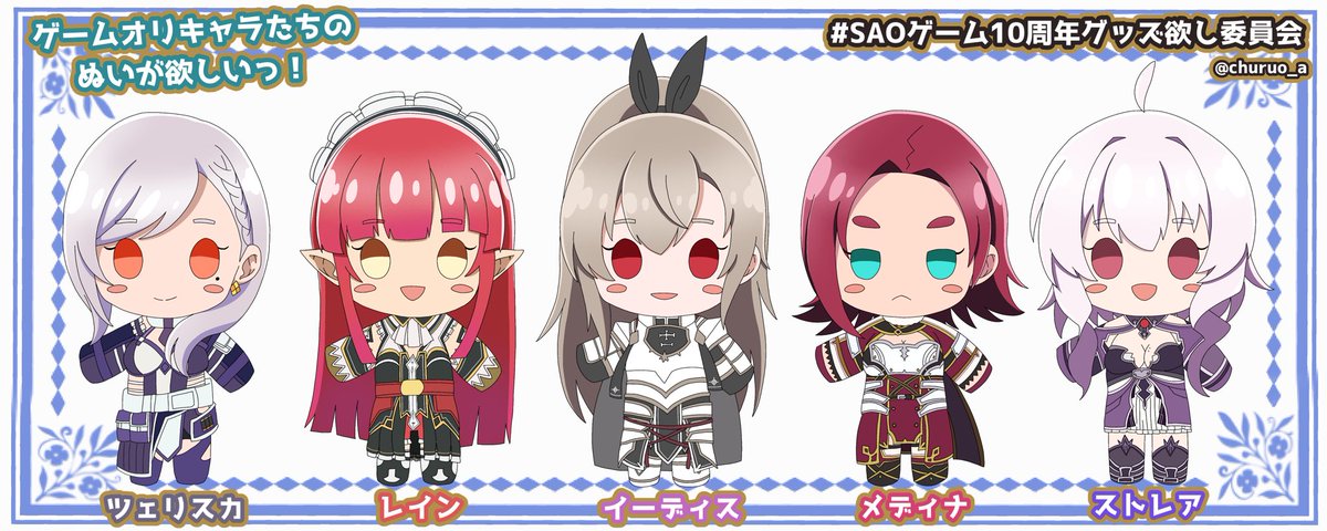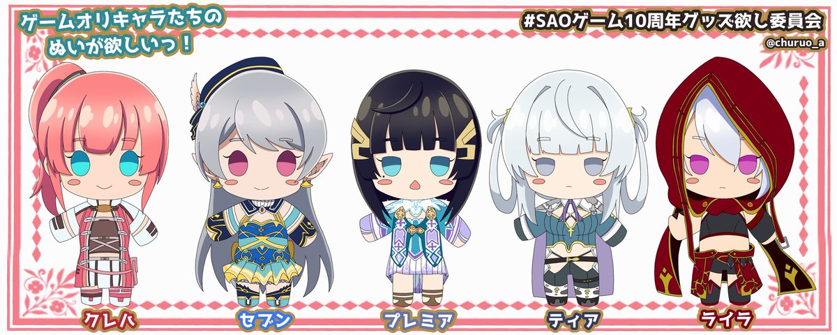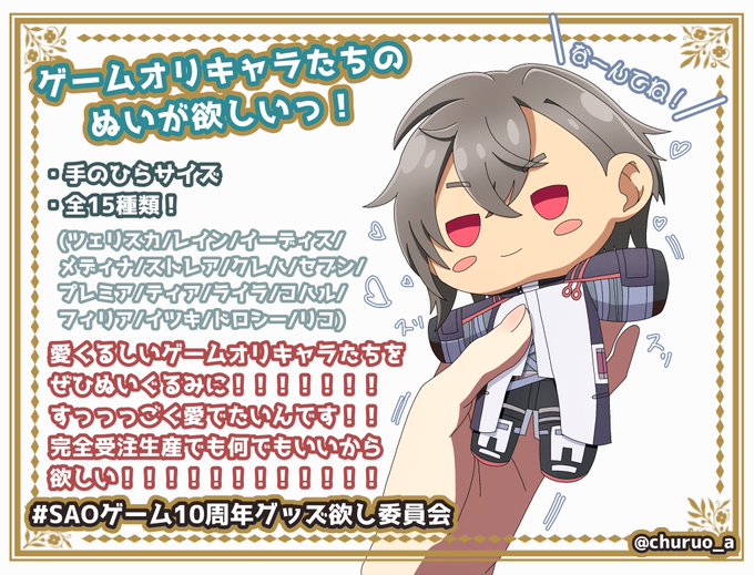 ゲームオリキャラたちのぬいが欲しいっ! こういう企画通してじゃないとゲームオリキャラたちのぬいって実現難しいと思うんです😭みんなのぬいが欲しい!ちょっとお値段高めの受注生産でもいいので欲しい!どうか、どうか、お願いします!!!!!!!!!!!!! #SAOゲーム10周年グッズ欲し委員会