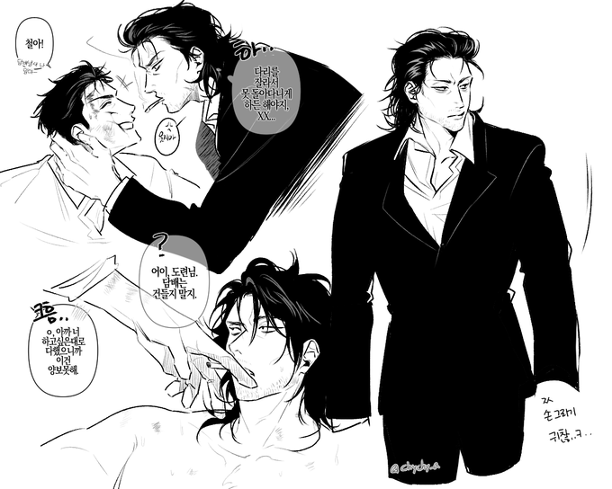 154 306 뭐 대충 곱게 자랐긴 하지만 아무래도 어딘가의 조직 아들인 대만이와 부하 철이 그런거... 반시계 방향으로 그렸는데 그리는 습관때문에 점점 몸집 불려지는거 웃김 23/03/19 21:38