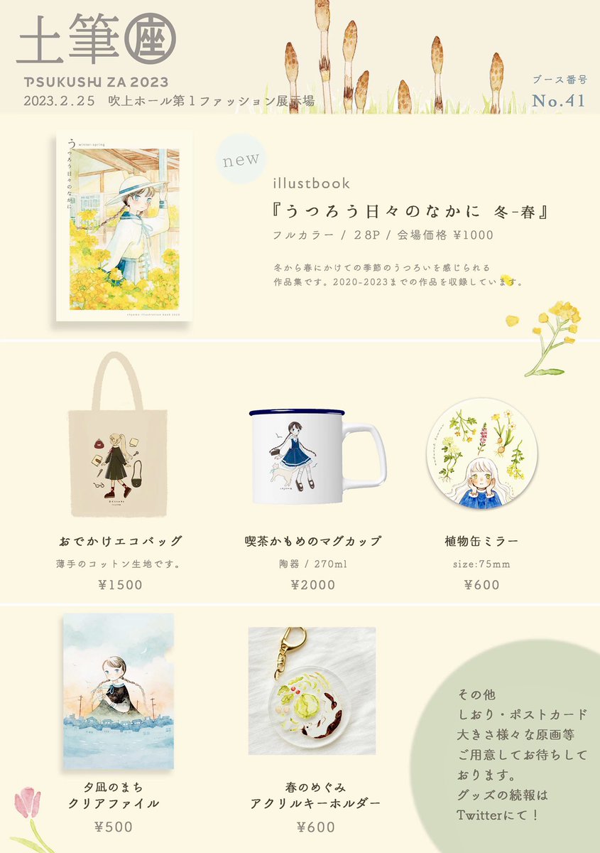 #tsukushiza 2023/2/25 土筆座に出展いたします! chyoma ブースNo.【41】 ▼出展作品の紹介 四年ぶりの新刊や、新しいグッズを販売させていただきます。また、大きささまざまな原画を計10点前後お持ちいたします。ぜひ画像をご覧ください🌸 ▼詳細ページ tsukushi-team.com/event/%e5%9c%9…
