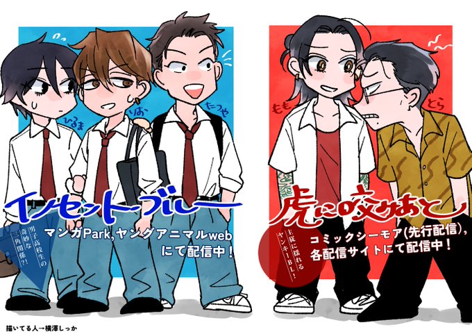 【連載情報】 🍑🐯虎に咬みあと(w/MAUVE) ■コミックシーモア cmoa.jp/title/257626/ ほか各配信サイトにて! 💙💙💙イノセント・ブルー ■マンガPark manga-park.com/title/70354?ur… ■ヤングアニマルweb younganimal.com/series/6dfc975… どちらの作品もよろしくお願いいたします! どっちも高校生☺️ #商業BL