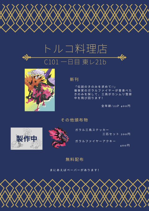 冬コミお品書きです 頒布物の半分が制作間に合って無いですがなんとかします! 30日(金)一日目 東レ21b トルコ料理店にてお待ちしています! ツリーに新刊サンプル #C101お品書き #C101 #C101新刊