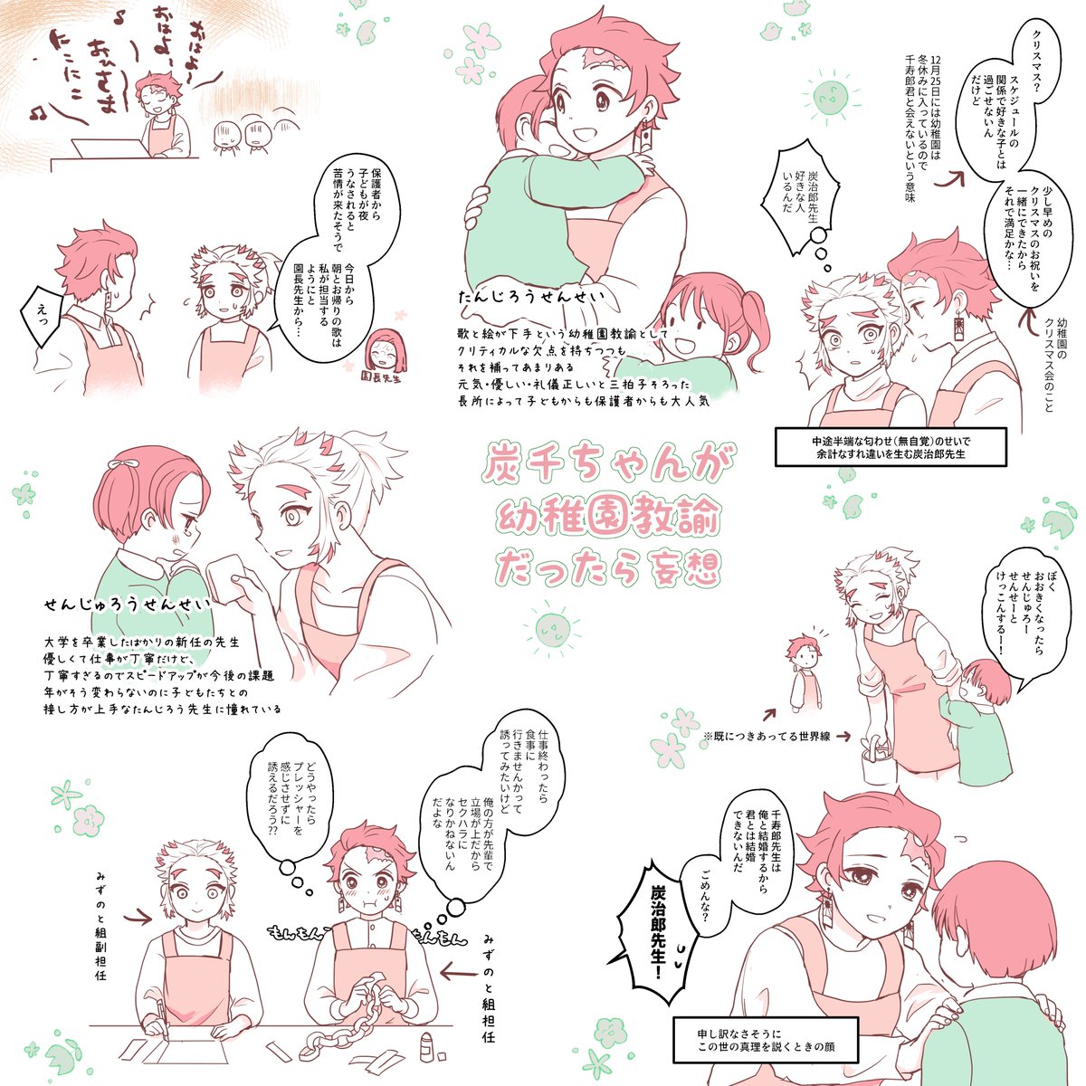 うちれん準備で後回しにしてたけど、引用のやつ今さら描きました ようちえん教諭の炭千🐥🐥 何も考えず浮かぶまま妄想を描き込んだので読みにくくてすみません!!!! 二人とも似合うと思う~~~! twitter.com/cicirll/status…