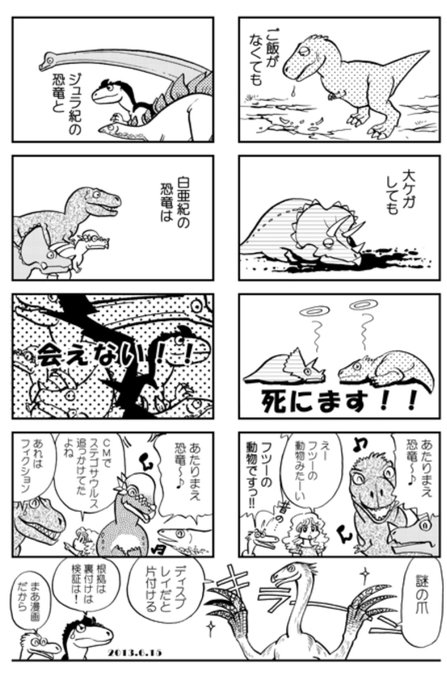 六本木の恐竜科学博が始まったので一昨年の時に描いた漫画を再掲しときますね。なお来月の #第7回古生物創作合同展示会 で出す予定の「でぃのまとめ伍」に入っていますのでよければ買いに来てください( ´ ▽ ` )ノ