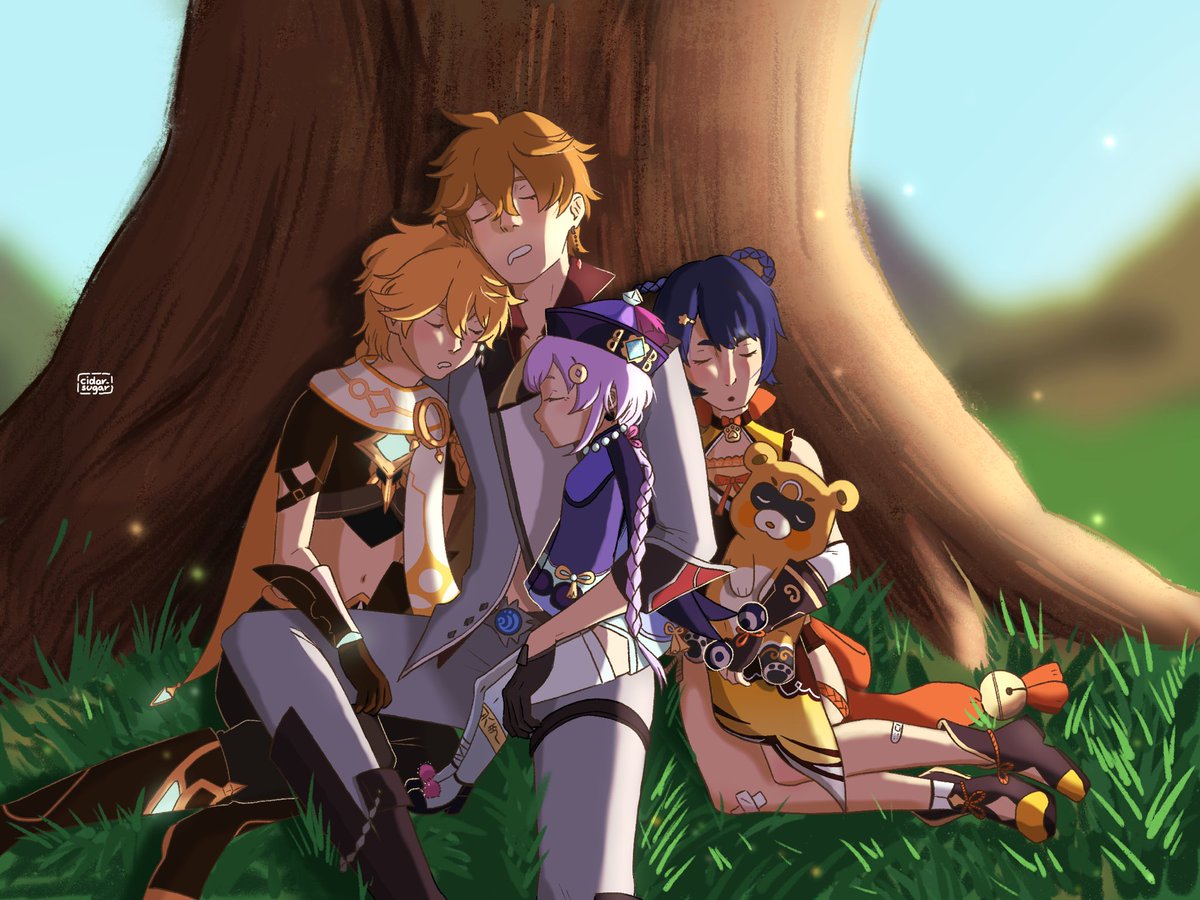 Early morning ☀️ based on one of my fave parties 🥺 @GenshinImpact #Tartaglia #childe #aether #xiangling #qiqi #Genshin #genshinimpactfanart #genshinimpact #原神