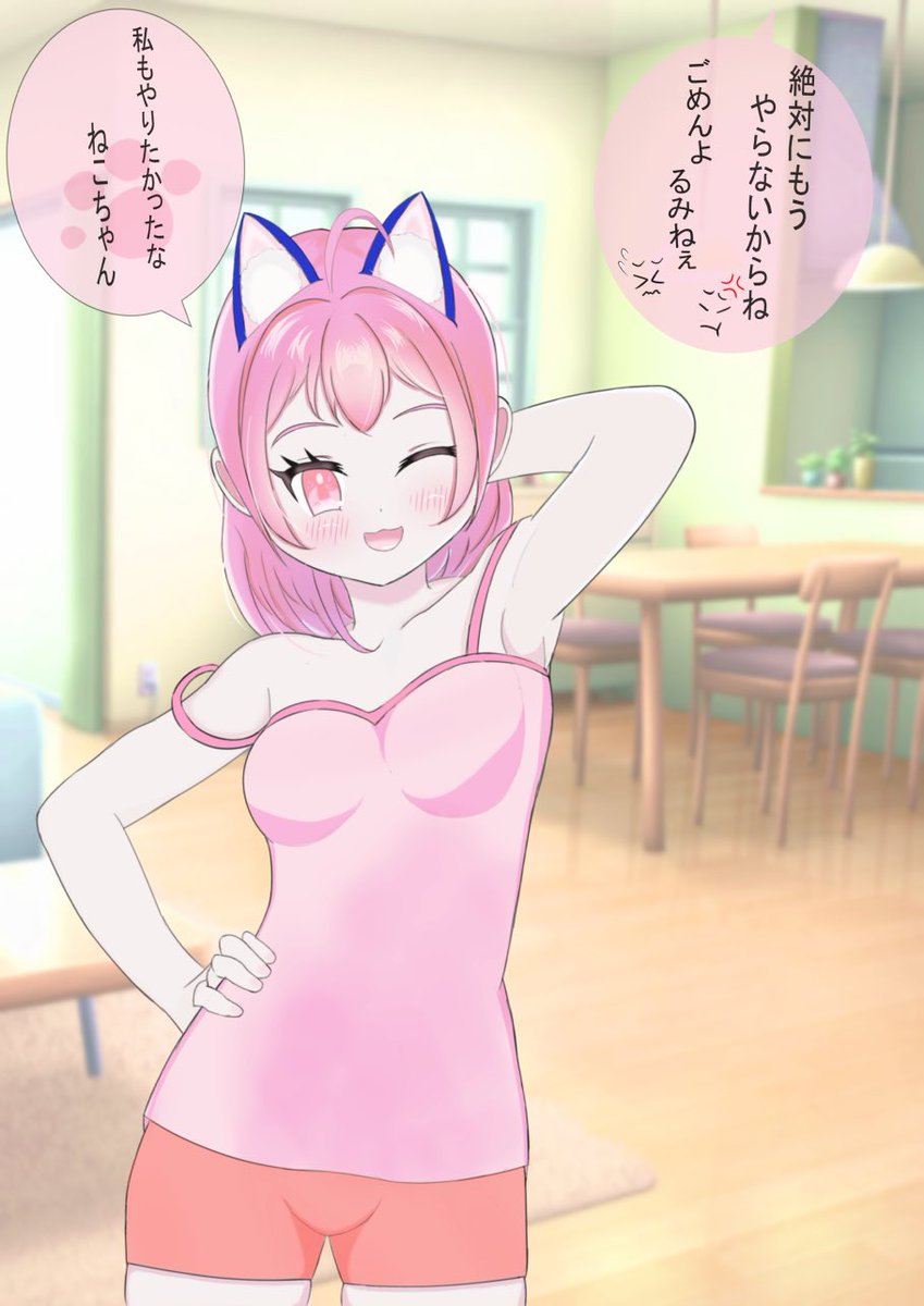 #オリジナルキャラクター #イラスト 猫の日のその後〜三姉妹家にて♪ (家だとテンション高めなしおんちゃん)