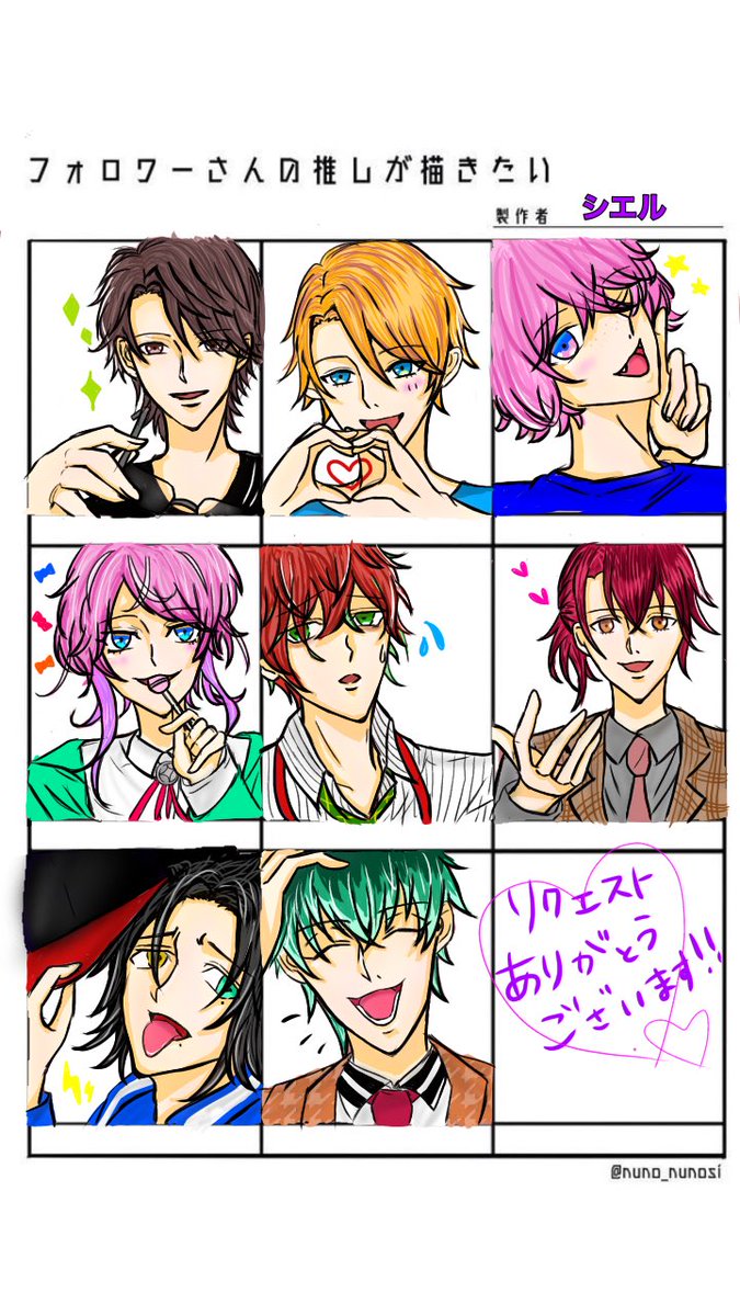 描き終わりましたー🙌 春くん、和南、阿修くん、乱数くん、独歩ちん、羽鳥さん、二郎くん、簓さん リクエストありがとうございました💓 初めて描いたキャラ多数なので似てない部分あると思います💦 また機会があれば描きたいです☺️💕 #フォロワーさんの推しが描きたい