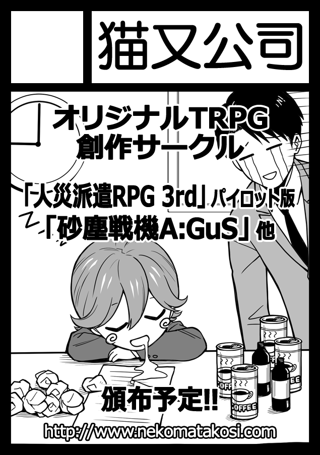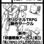 許可がとれたので公開! c98サークルカットです! メカデザイン&表紙は鈴木ぷらも(@puramo0607)様にご依頼しました! 見てよこの武骨なデザイン……!! 正直にお言い……!! 心が……踊るだろ……!? ・▽・ノ<あとはゲームを完成させるだけだぜーっ!! #c98 #砂塵戦機 #同人TRPGカタログ