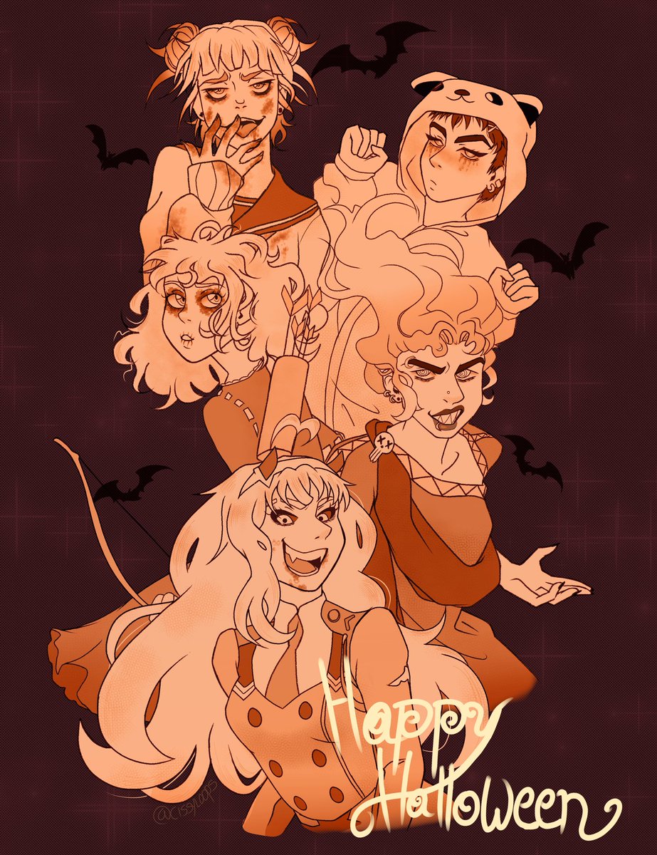Happy late halloween to y'all! For the ones that don't get at first sight their costumes: Cissy- zero two Gollie- Hades (female version) Nealie- Merida (brave) Crystal- random polarbear ???????- himiko toka #inktober #halloween #myocs #ocdrawing #characterdesign #digitalart
