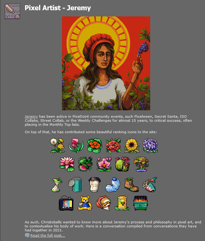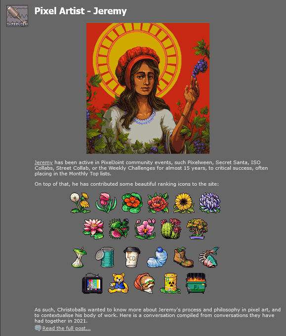 Hi! Thought I'd let you know I conducted an interview with the fantastic @pixellerjeremy over on @pixeljoint. It goes in depth about #pixelart, so check the link in the tweet below!