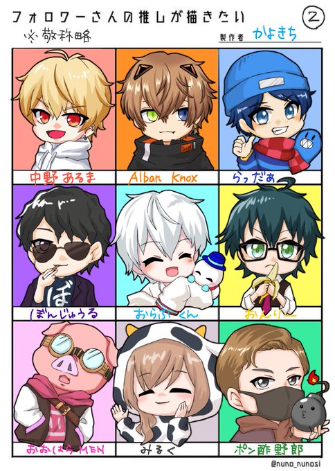 #フォロワーさんの推しが描きたい 2枚分完成しました! 2/2 リプ頂いた推し様(敬称略) ▶中野あるま ▶Alban Knox ▶らっだぁ ▶ぼんじゅうる ▶おらふくん ▶おんりー ▶おおはらMEN ▶みるく ▶ポン酢野郎 twitter.com/cl_kaaayo/st…