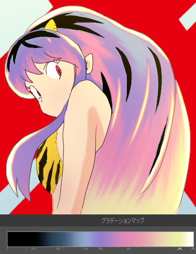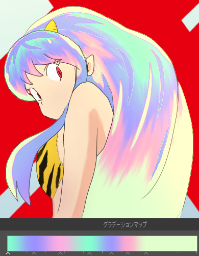 グラデーションマップとは、ざっくりいうと明るさに応じて設定した色を付ける調整レイヤー、だそう。 グラデーションを変更すると原作のピンク髪風になったり、玉虫や油滴、CDの表面のようなリアルな構造色になったりします🤖 #うる星やつら #ClipStudio #クリスタ #イラスト好きさんとつながりたい