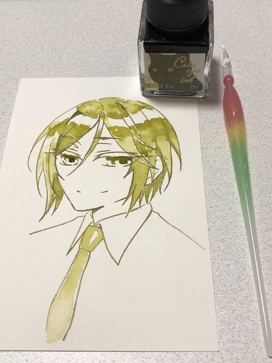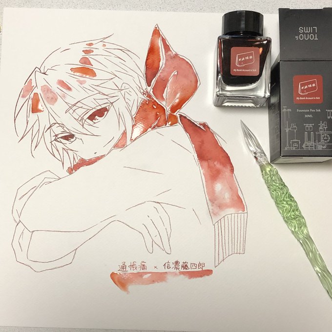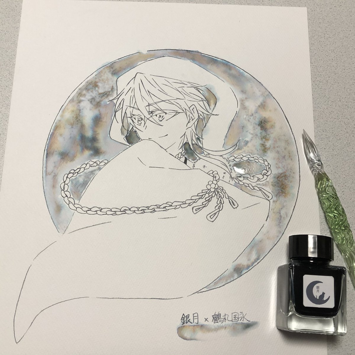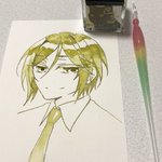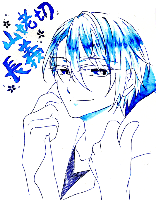 山姥切長義さんの輝かしい記念日と聞いて! 以前ふぉろわさんに選んでもらった山姥切さんにぴったりなインクで描きました(*´艸`*)おめでとうございます&益々のご活躍を楽しみにしております #2月18日は山姥切長義旧国宝指定日 #2月18日は山姥切長義重文記念日 使用インク:コバルトジャズ(Diamine)