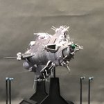 ハセガワ 1/3000 重巡洋艦コルドバ。小説版クラッシャー・ジョウ2・3巻や針井佑によるそのコミカライズで活躍した全長約1キロメートルの宇宙巡洋艦とその搭載突撃艇。パーツの小ささに泣かされた。色指定は無視して自分好みで塗りました。だって黄色が多いんですもの。 #今月作ったプラモ晒そうぜ