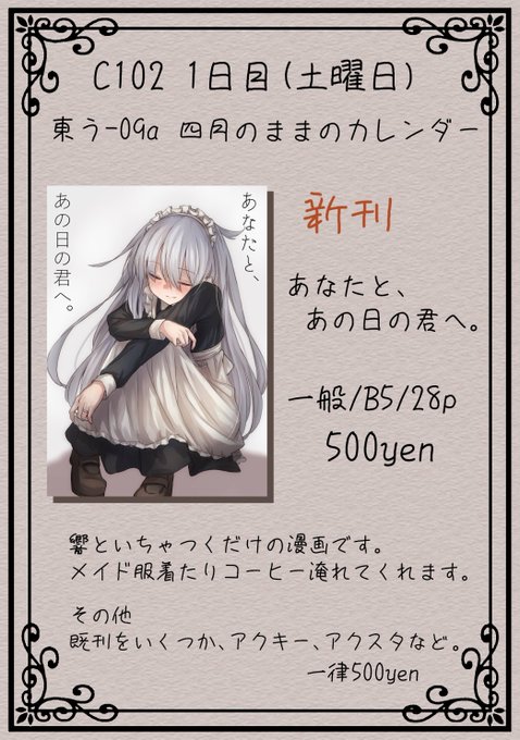 174 521 夏コミ1日目で頒布する響本です。 響といちゃつくだけの漫画です。 響がメイド服着たりコーヒー淹れてくれたりします_(:3」∠)_ (1/2) 23/08/10 20:37