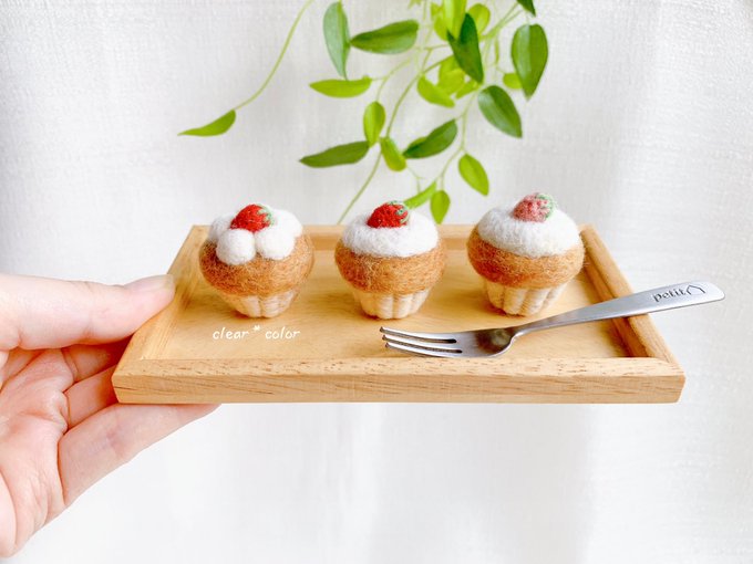 3 36 羊毛×カップケーキ いちごの色を変えたり、 トッピングの仕方を変えたり🧁🍓 #羊毛フェルト 23/06/01 21:26