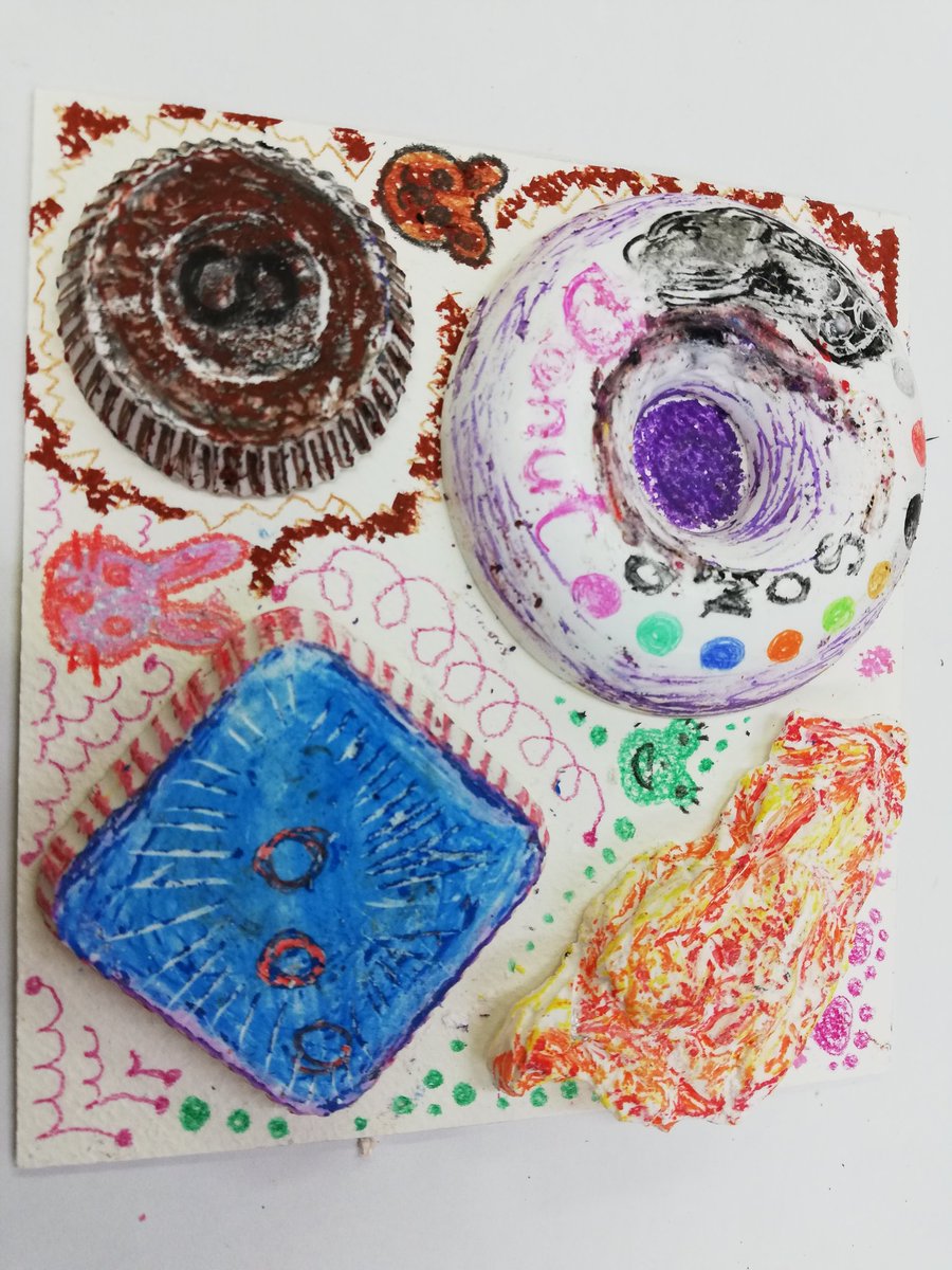 臨床美術(ミニ美術) #臨床美術 #石膏 #型抜き #オイルパステル #色鉛筆 #台紙 #動物 #ドーナツ #チョコ #くま #うさぎ #かえる #足あと #赤 #青 #黄 #紫 #緑 #黒 #橙 #白 #茶 #藍