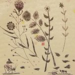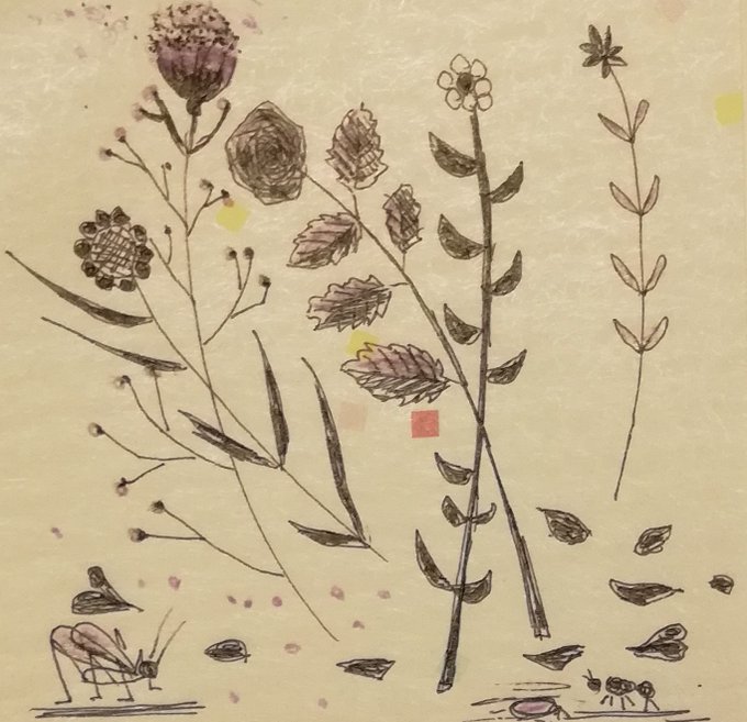 真夜中の花と虫たち 和紙に0.28のペンと紫のチャコエースで描きました