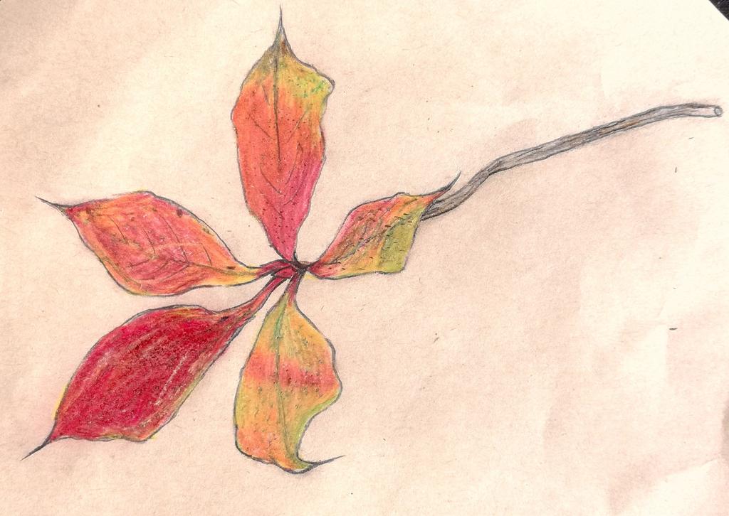 今日の1枚 朝散歩のおみやげ #今日の1枚 #絵 #スケッチ #写生 #色鉛筆 #鉛筆 #赤 #橙 #黄 #緑 #黄緑 #茶 #黒 #葉脈 #枝 #朝散歩のおみやげ #メモ #紙 #一枝 #colver #1時間 #電動消しゴム