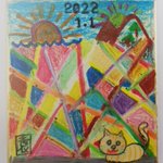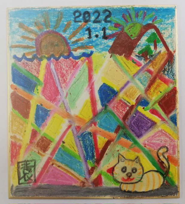臨床美術(ミニ美術) 2021年12月28日(水曜日) #臨床美術 #色紙 #オイルパステル #色鉛筆 #ファーバーカステル #ひっかき棒 #割り箸 #ダーマトグラフ #ベビーパウダー #サイン #日付 #虎 #初日の出 #ティッシュペーパー #海と山 #全色使用 #太陽 #色面 #線 #面 #水曜日 #今年最後 #写真 #スマホ