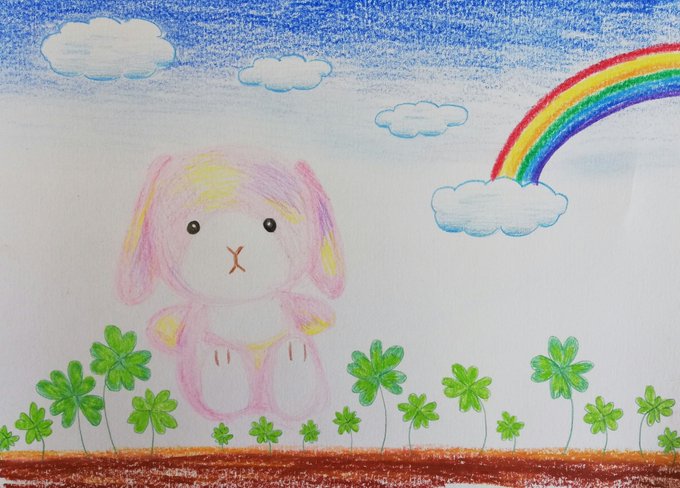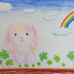 子どもたちと一緒に私も絵を描きました🖍️ みんなに大人気だったミミちゃんがクローバーの野原で虹を見ている絵です🐰🍀🌈 毎晩ミミちゃんの夢が見られますようにとお祈りしているので見たい夢の情景を思い浮かべながら描きました またにはこんな子供っぽい絵もいいかなぁ🤗 おやすみなさい🙇♀️🐰